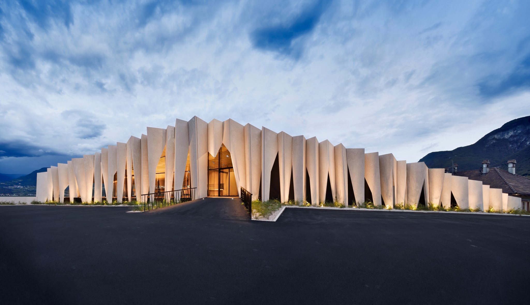 Kellerei Kurtatsch: de gevel doet denken aan de karakteristieke Dolomietrotsen waarop het dorp Kurtatsch is gelegen. Ontworpen door lokale architecten en gebouwd met duurzame technieken, biedt het panoramisch uitzicht over de vallei. Het geheel wordt verrijkt door de artistieke etiketten van ontwerpster Carmen Maria Alber.